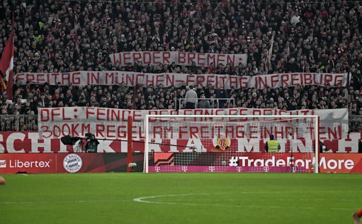 除了口号外,极端的拜仁球迷还展示了横幅,用以表达他们的抗议。尤其是南看台上的横幅,上面写道:“不莱梅:周五在慕尼黑,周五在弗赖堡。DFL:球迷的敌人。够了!周五请遵守300公里规则!”横幅背后的含义明显,对周五比赛安排的不满意已经积聚到了爆发点。